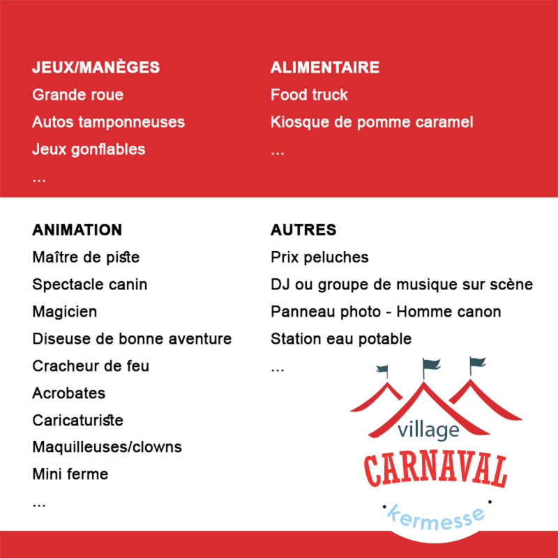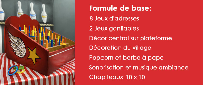 Plusieurs jeux de kermesse, jeux gonflables, décors uniques et animateurs des jeux sauront créés une ambiance à la fête. Possibilité d'ajouter des animations ambulantes, spectacles familiaux, petits manèges et bien plus ...